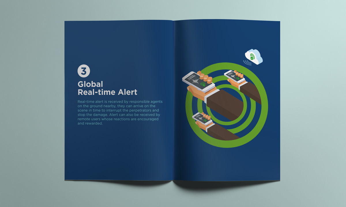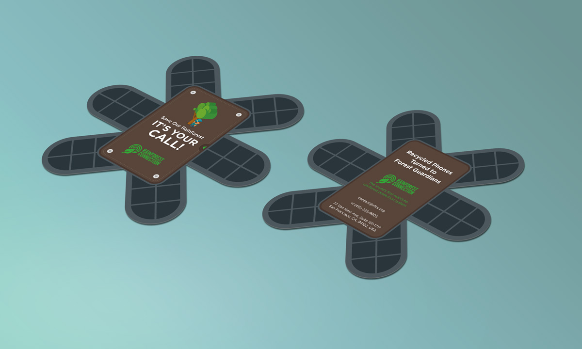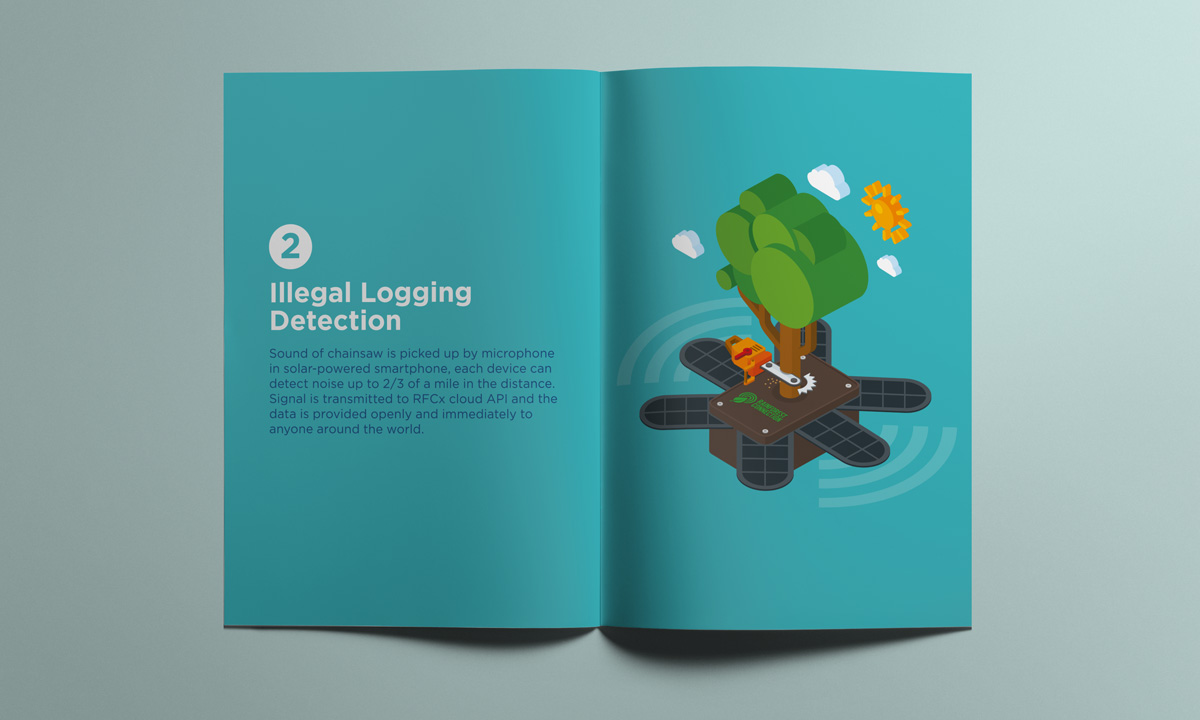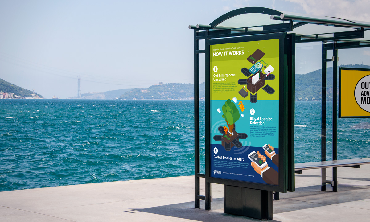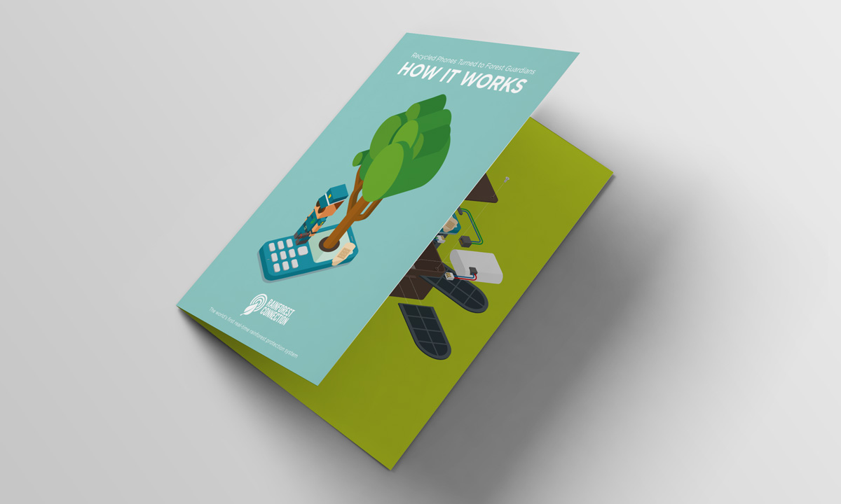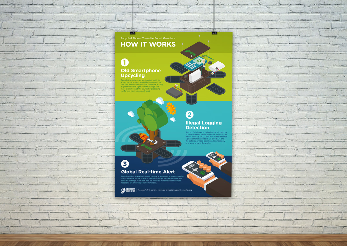 This self-initiated project is intended to develop a marketing collateral redesign for the Rainforest Connection (RFCx) that helps promoting their goal of action against illegal logging in rainforests. Infographic presentation is explored to succinctly visualize the mechanism of detection system and the old smartphone upcycling process.