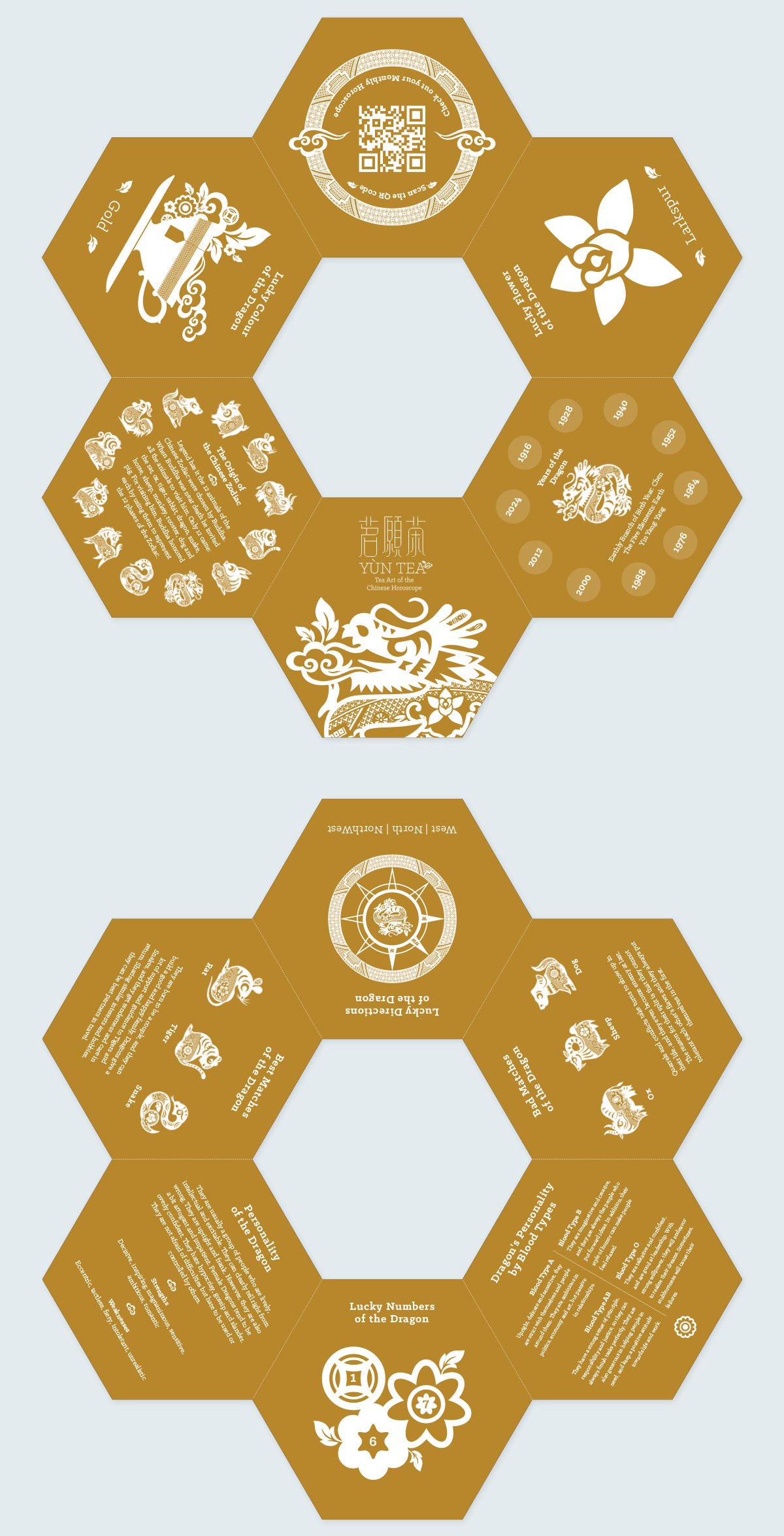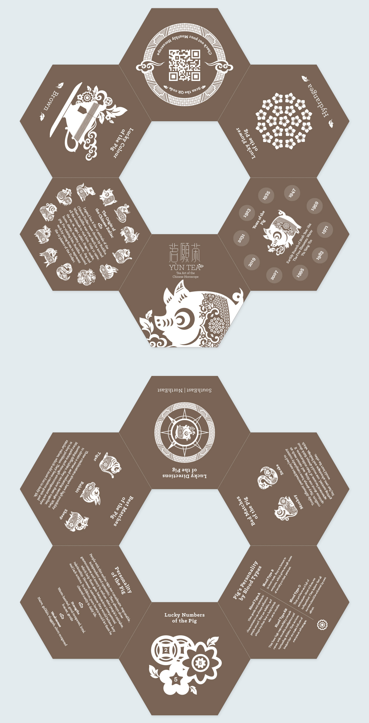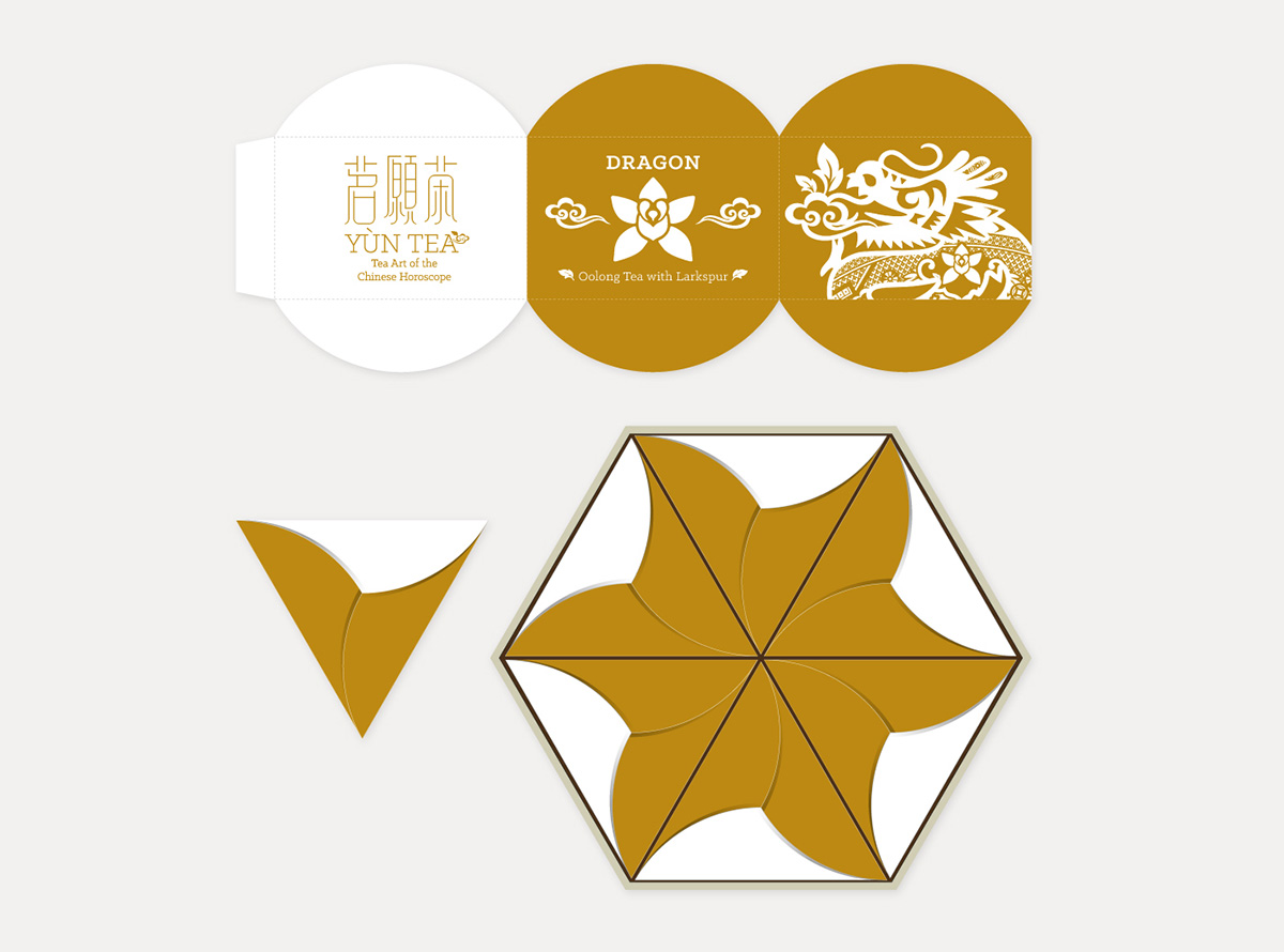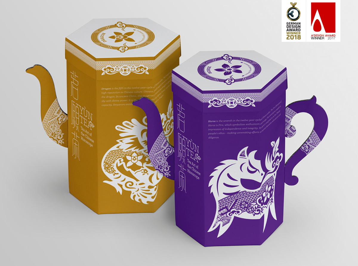 Yùn Tea (茗願茶) is a premium tea gift collection with the concept of Chinese zodiac and horoscopes, incorporating a bilingual brand identity, that helps to promote this Chinese cultural tradition to the worldwide people through an innovative approach and contemporary tone of voice. The graphic style of western chinoiserie willow pattern has been manipulated with the eastern Chinese papercutting zodiac character, that creating a unique visual identity which is related to tea and zodiac lucky flower.